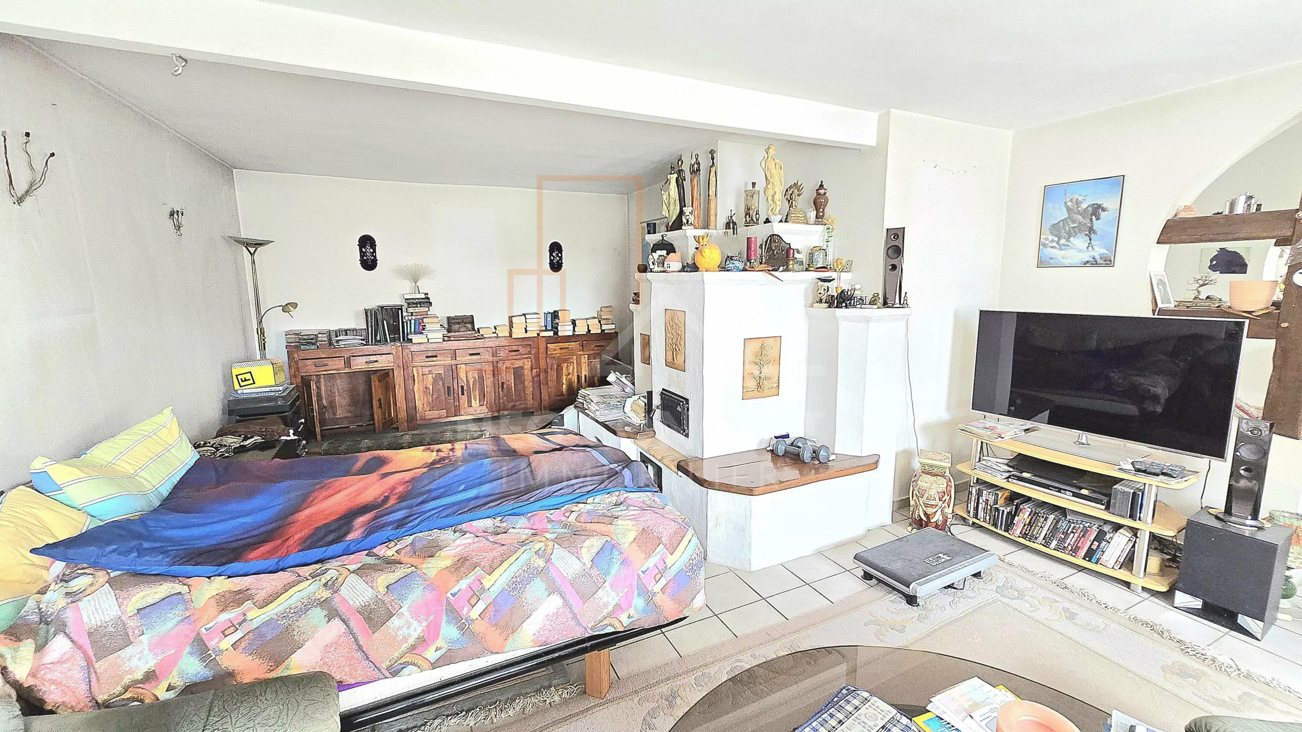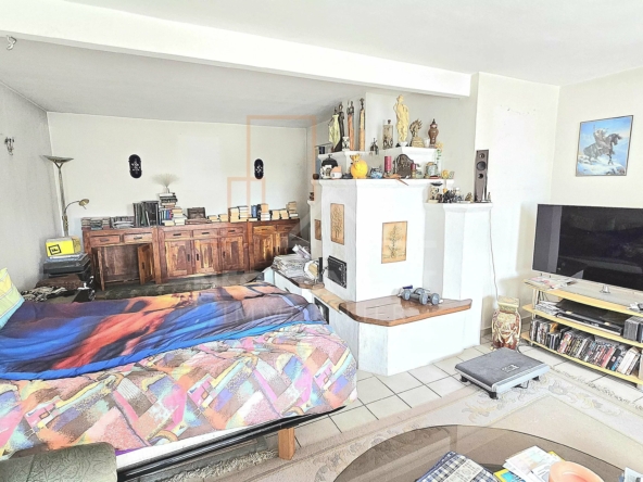 – Rez-de-chaussée : une entrée, une cuisine équipée ouverte sur la salle à manger, un spacieux séjour d’environ 33m² avec son beau poêle à faïence, et un wc.