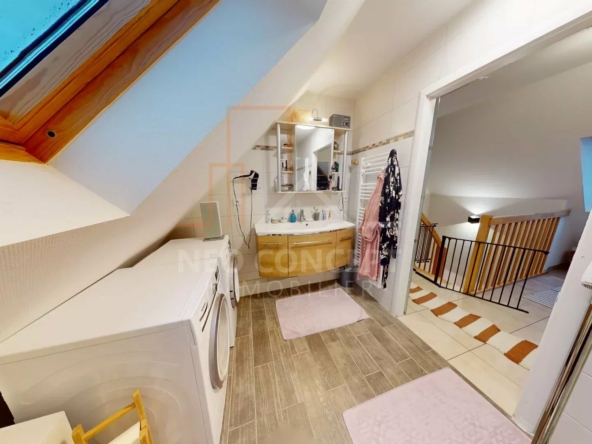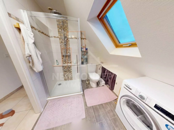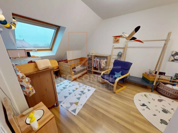 L’étage vous offrira deux chambres de 10 m2 et 11m2 et une salle d’eau avec wc.