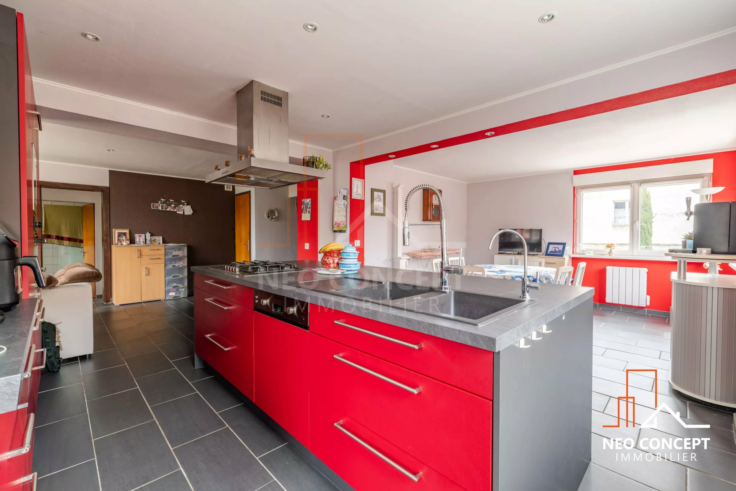 une cuisine équipée ouverte sur une spacieuse pièce de vie,