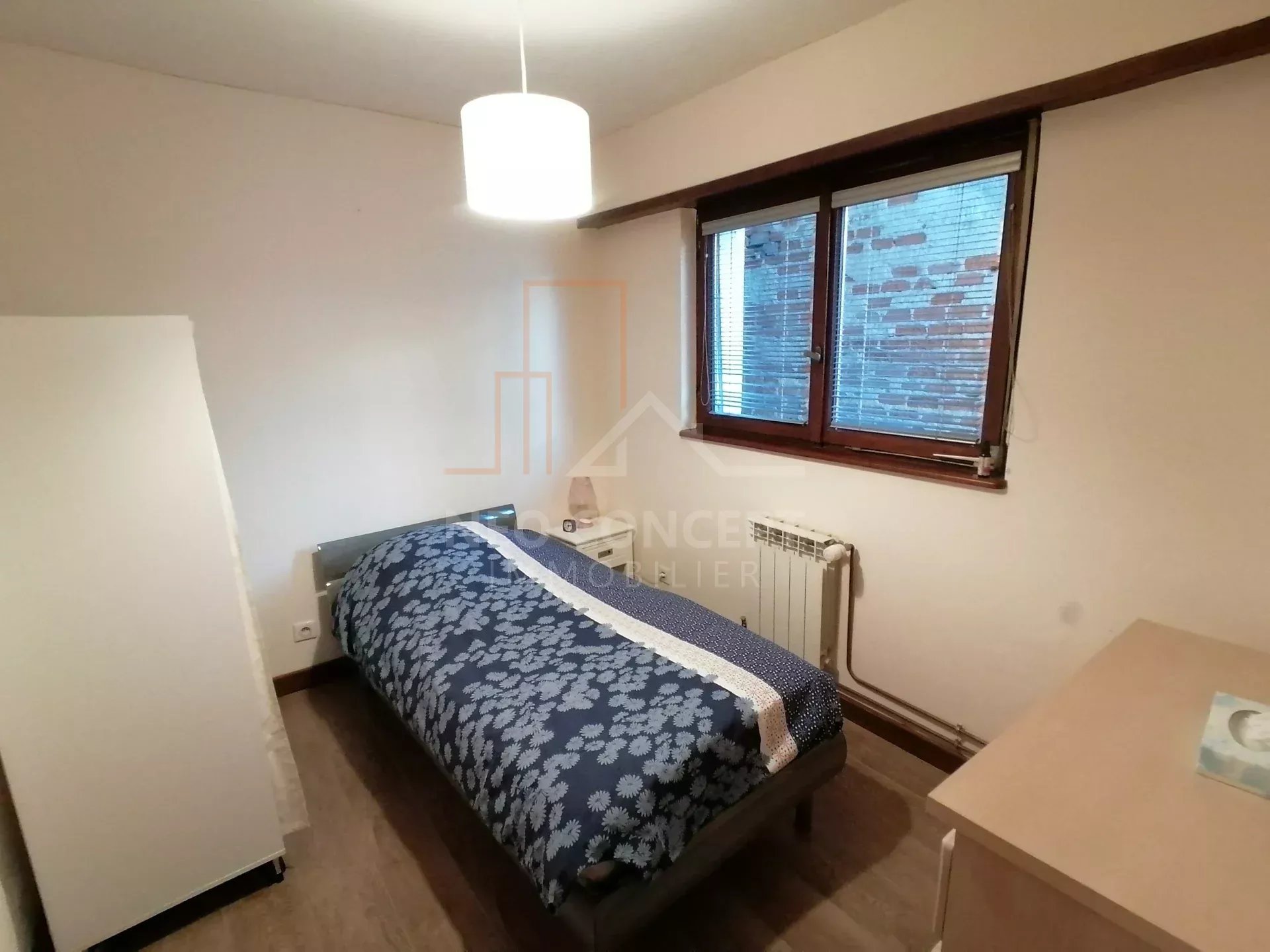 Il se compose d’une entrée, d’une chambre, d’une cuisine semi équipée ouverte sur le séjour, d’une salle d’eau avec un wc.