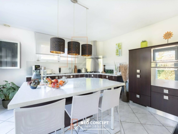 Cuisine d’épicurien : Entièrement équipée avec son îlot central, elle s’ouvre sur l’espace d’été. Cuisiner devient un plaisir partagé avec vos proches, tout en gardant un œil sur le jardin.