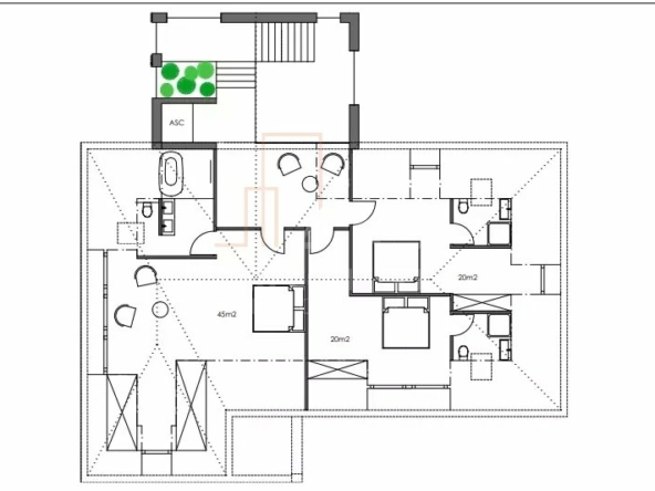 A l’étage sont prévues 3 grandes chambres avec une salle d’eau chacune, mais les environ 150 m² au sol que vous offre ce niveau vous permettent d’imaginer encore bien d’autres aménagement.