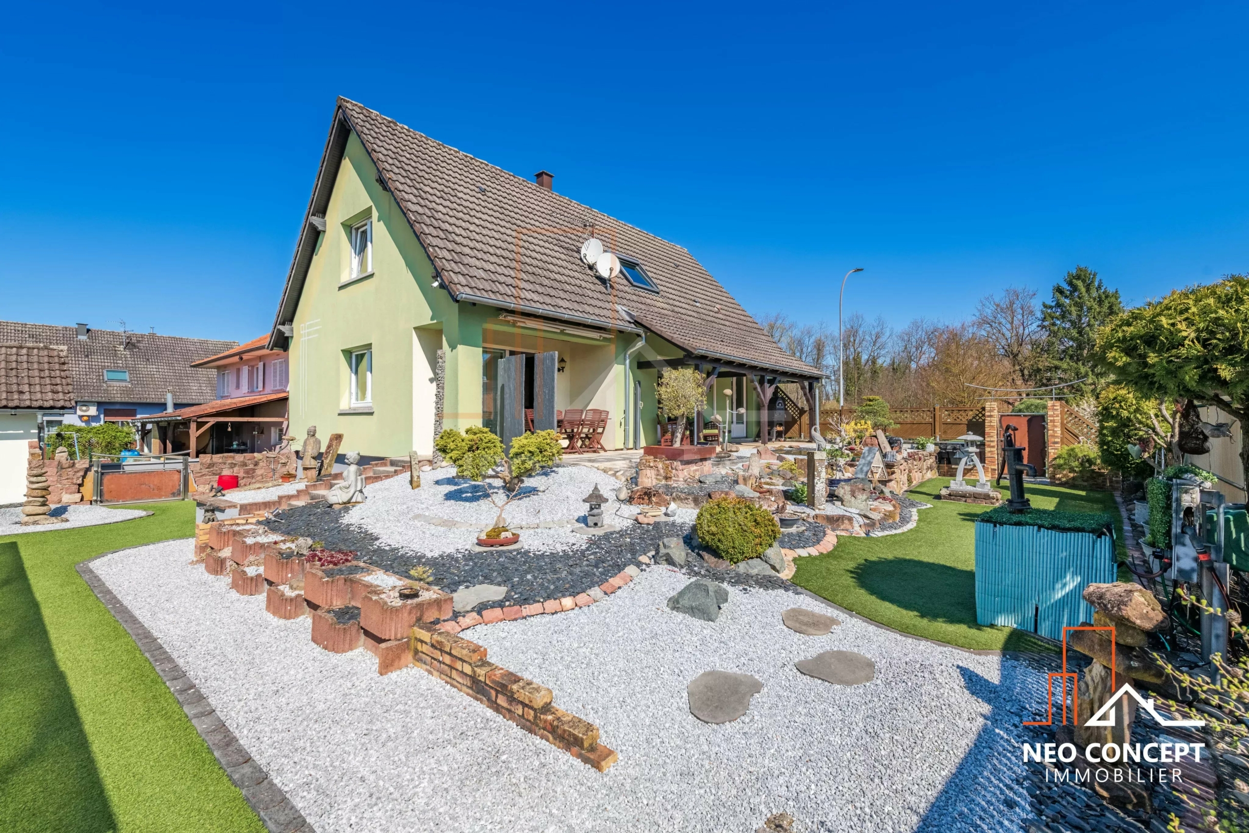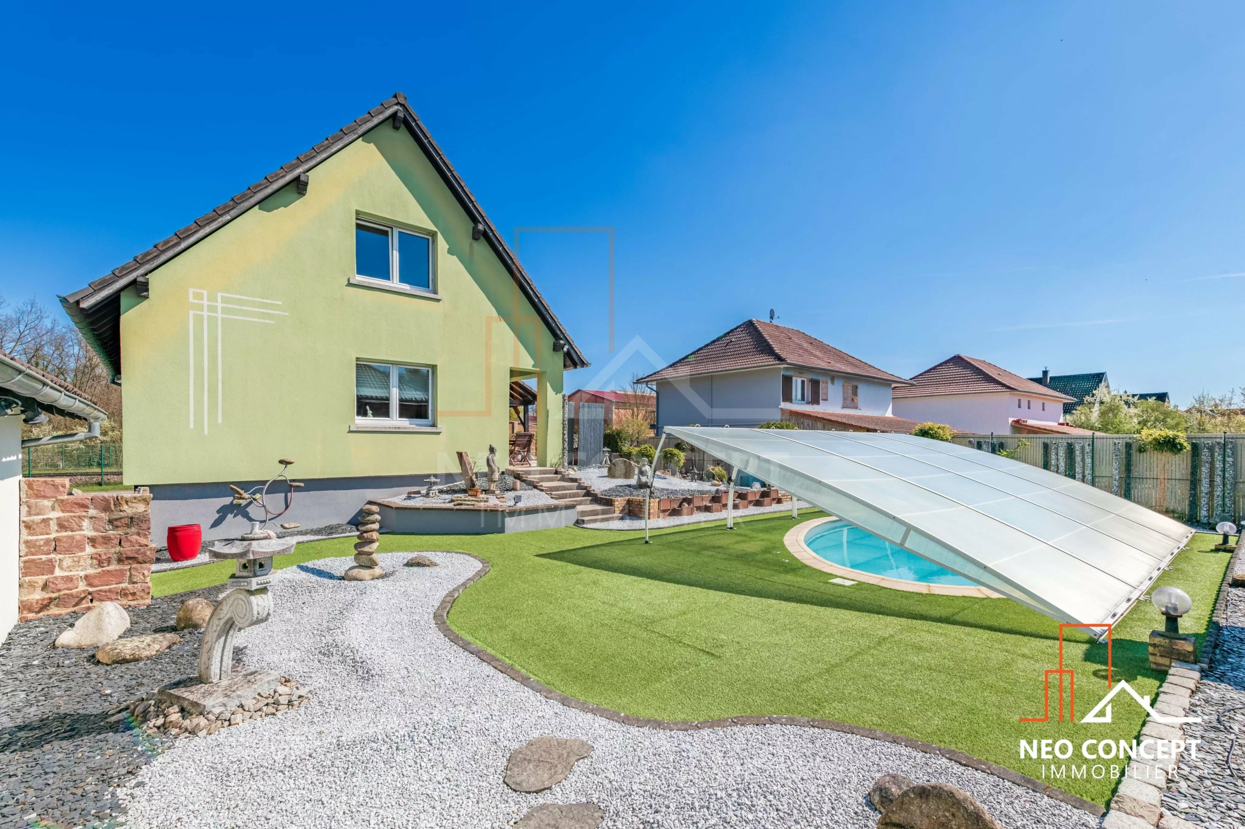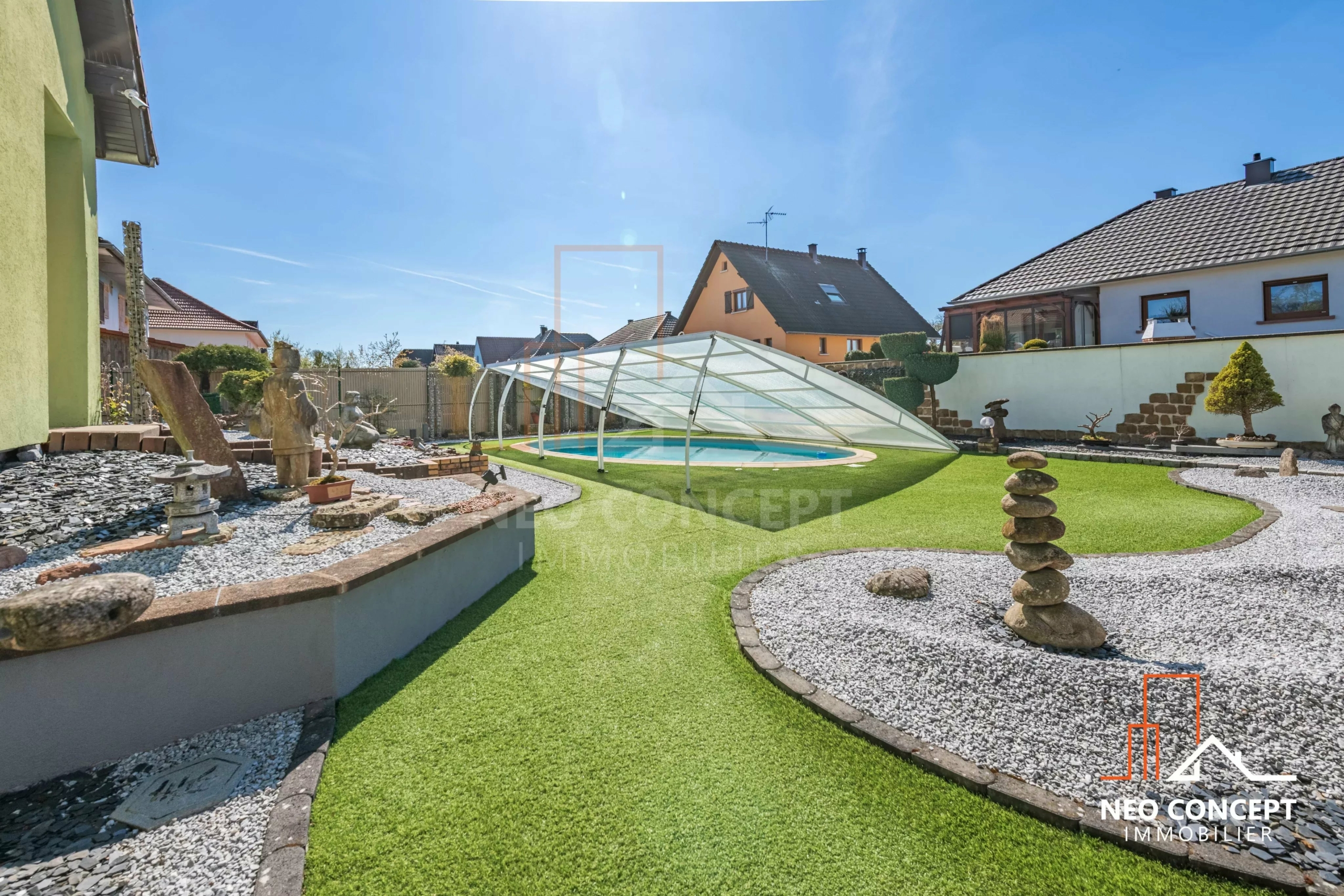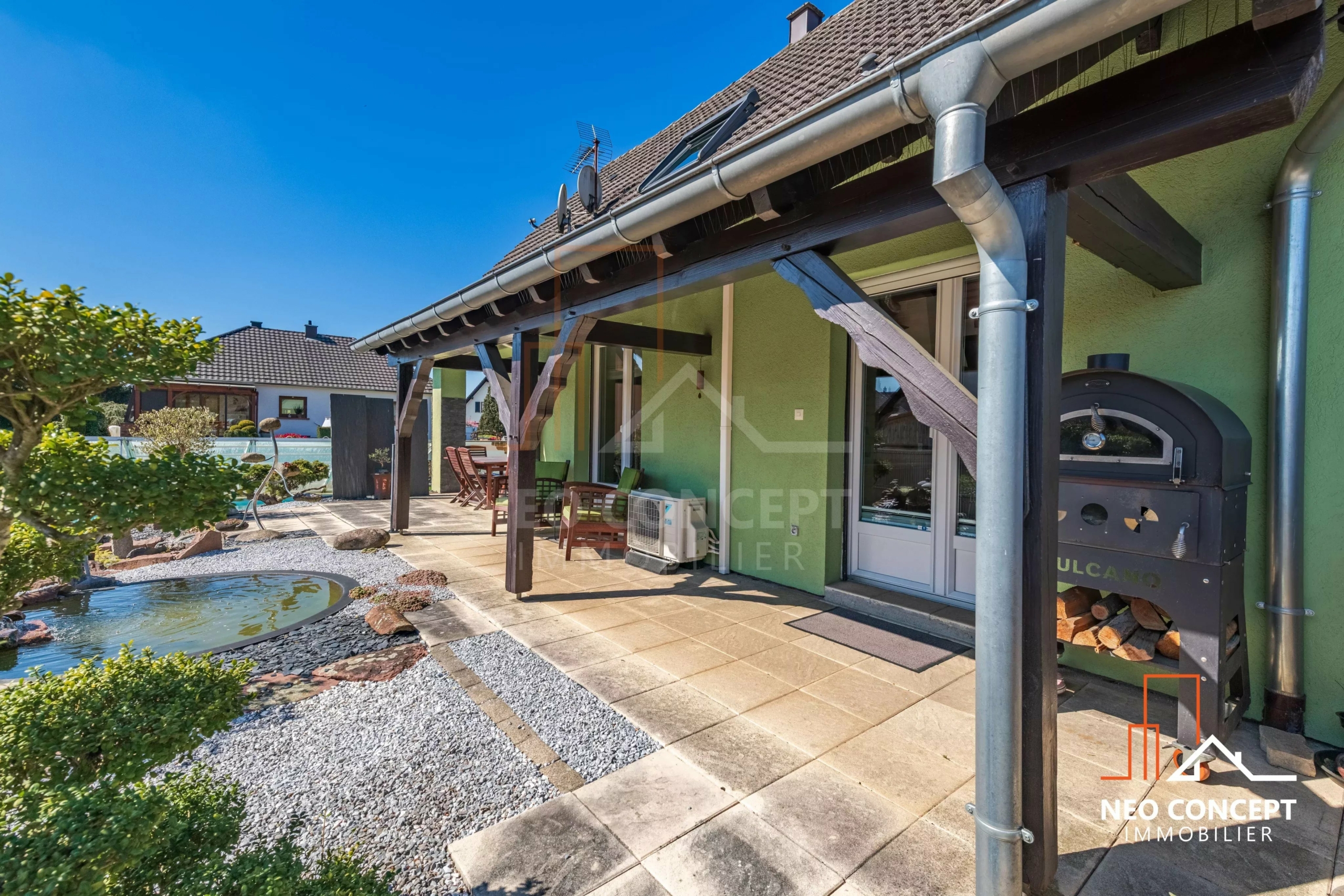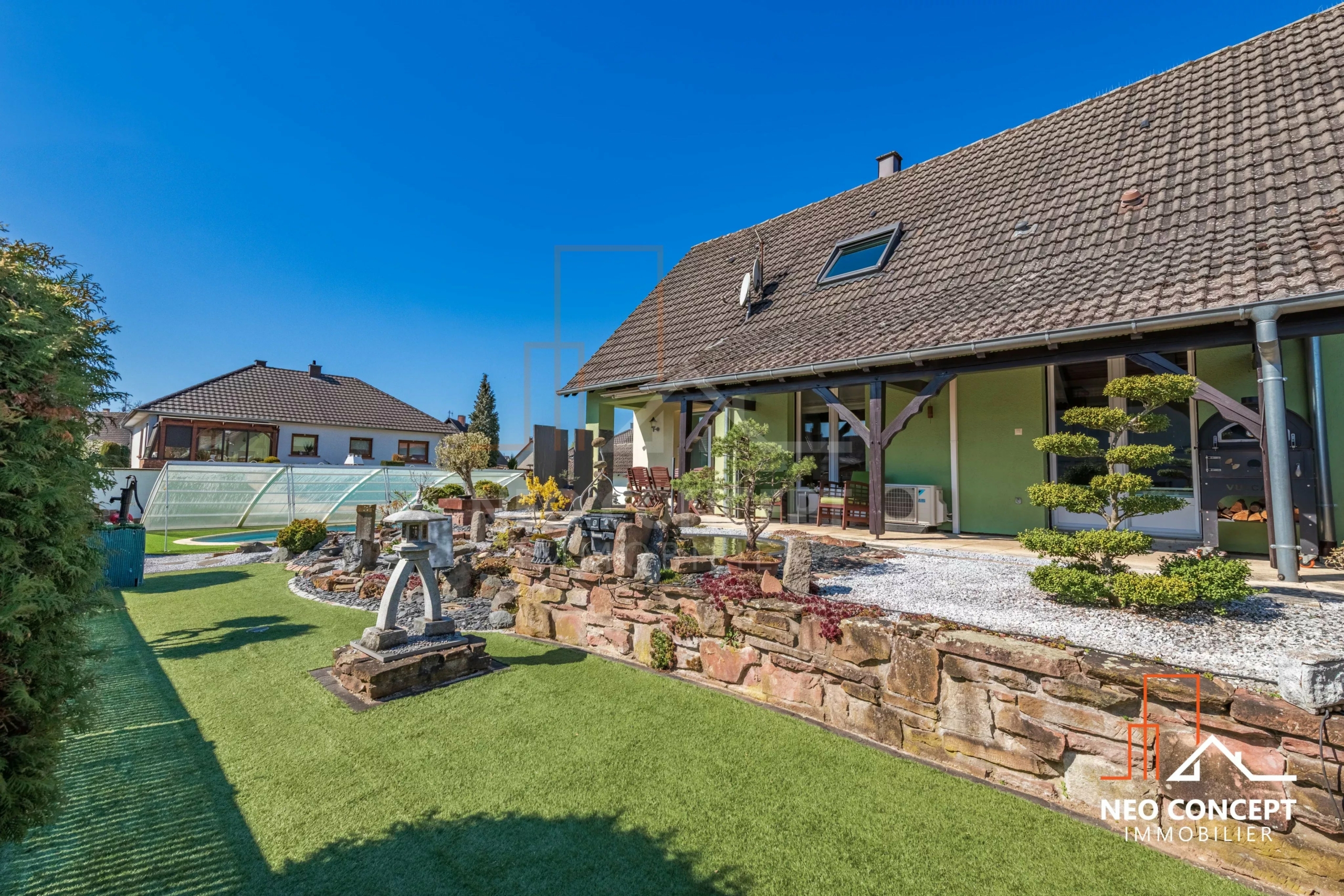 À l’extérieur, vous profiterez d’un jardin soigneusement aménagé avec piscine, filtration automatique, terrasse et espace détente. La piscine n’est actuellement pas chauffée, mais l’installation d’un système de chauffage reste possible.