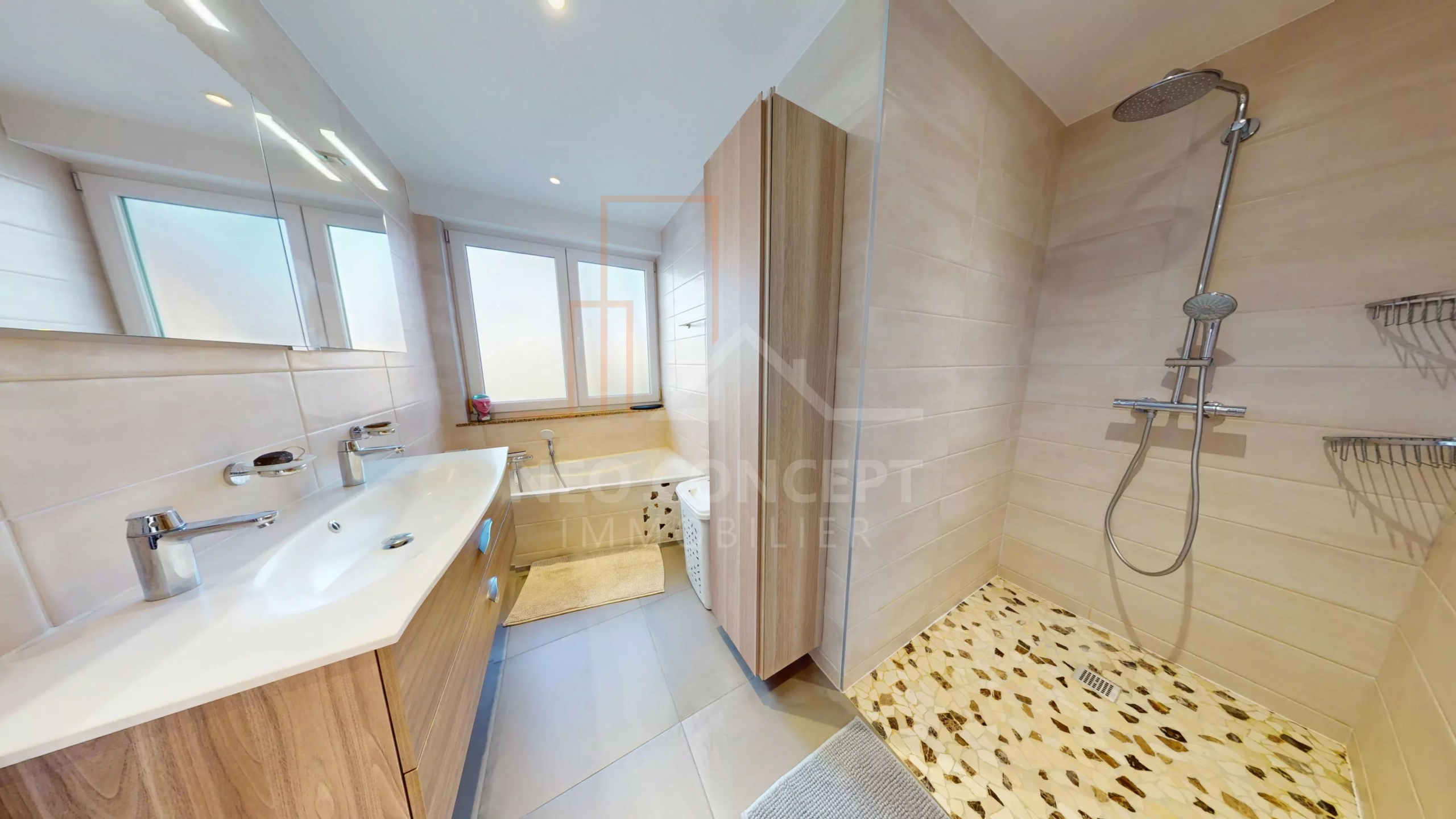 Entrée, cuisine équipée, séjour lumineux avec accès véranda, 2 chambres, salle de bains avec baignoire + douche à l’italienne, WC séparé.